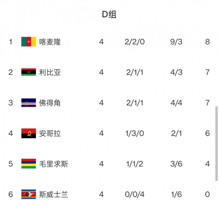 D组:8次参加世界杯的喀麦隆占据榜首,利比亚、佛得角、安哥拉紧随其后