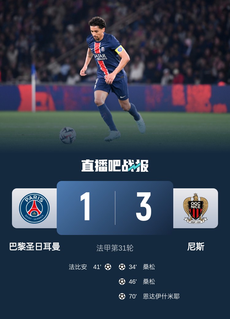 法甲赛场,巴黎1-3不敌尼斯,球队联赛赛季不败遭到终结。