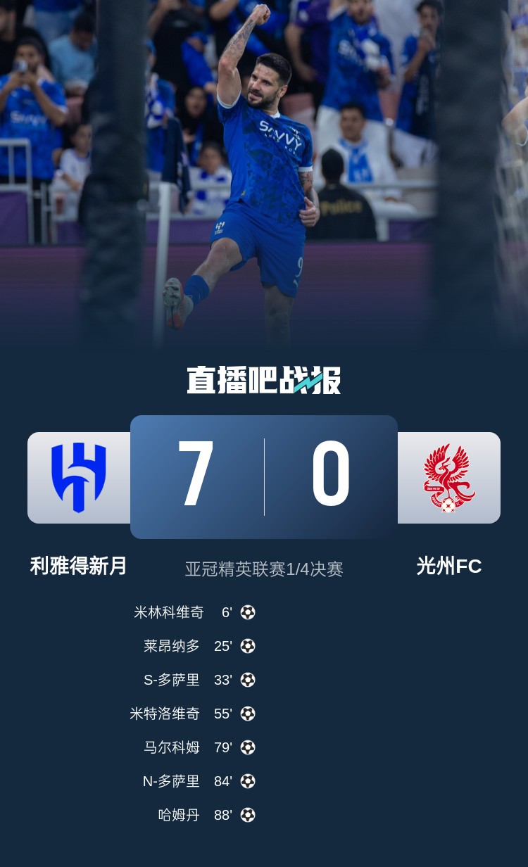惨案!利雅得新月7-0光州FC晋级四强 米神一射二传米林传射建功