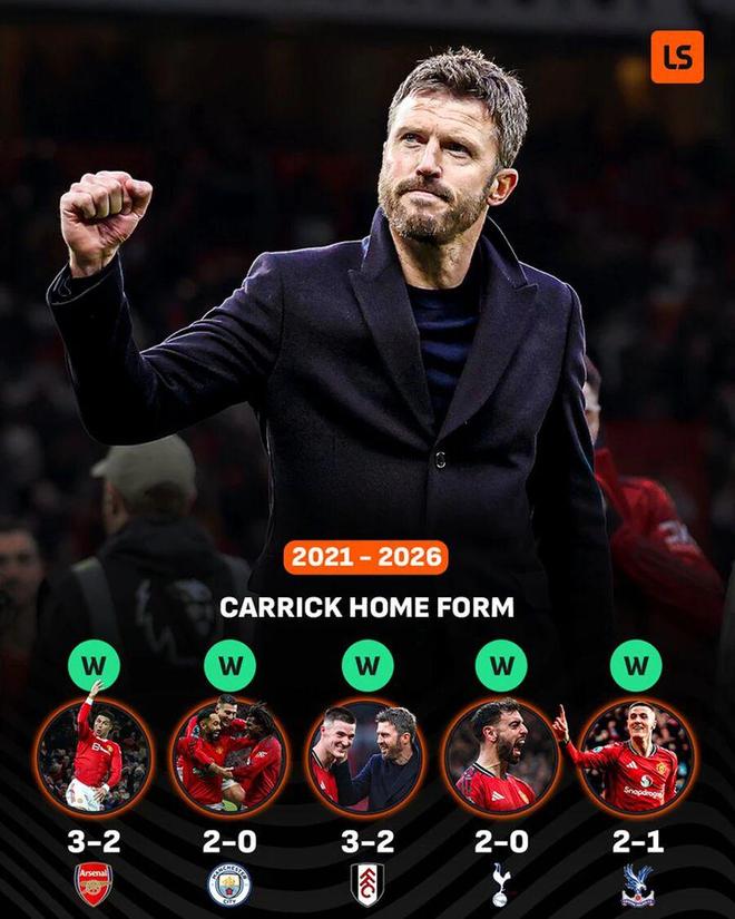 这场比赛逆转取胜,也使得卡里克成为55年来首位执教曼联后前5个主场全胜的主教练。作为曼联主教练,卡里克在前9场英超比赛中为球队赢得了23分,他两次执教红魔至今保持不败,战绩为7胜2平。