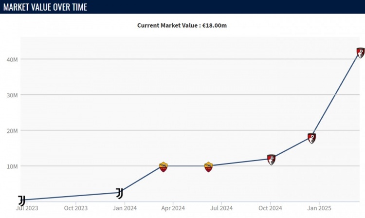 2025-03-18 21:42:00暴涨2400万欧,19岁伯恩茅斯后卫怀森身价已达4200万欧