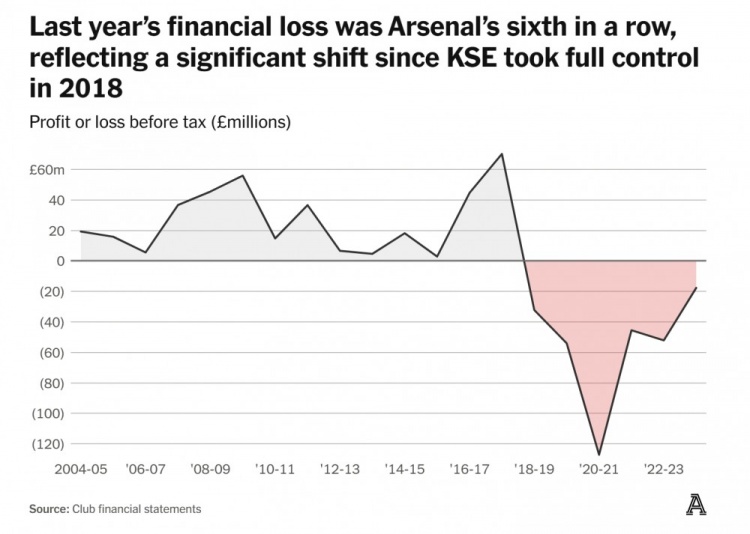 在2018年之后,阿森纳连续六年出现财务亏损,也体现了阿森纳财务所有权重大转变后的影响